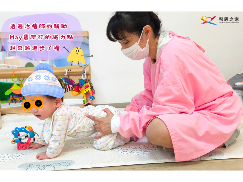 如今的他,已從最初的不穩定,慢慢進步到能夠自己站立了。這樣的改變,讓一路陪伴的保母看在眼裡,滿是感動與欣慰。現在的 May 寶,能自在地和其他寶寶一起玩耍,也悄悄成為大家眼中溫柔的小小夥伴。